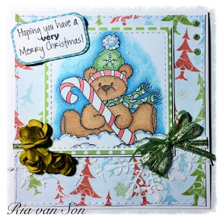 I used one of Lozzy's Christmas papers (kindly provided by Lozzy as one of our sponsors) for the background of my card, wrapping some beautiful organza sparkly ribbon around some deep blue mirror card and adding a pyramage picture from Kanban bought years ago. The sentiment was computer generated and printed. For more info about the card please look here on My Crafty Outlook.